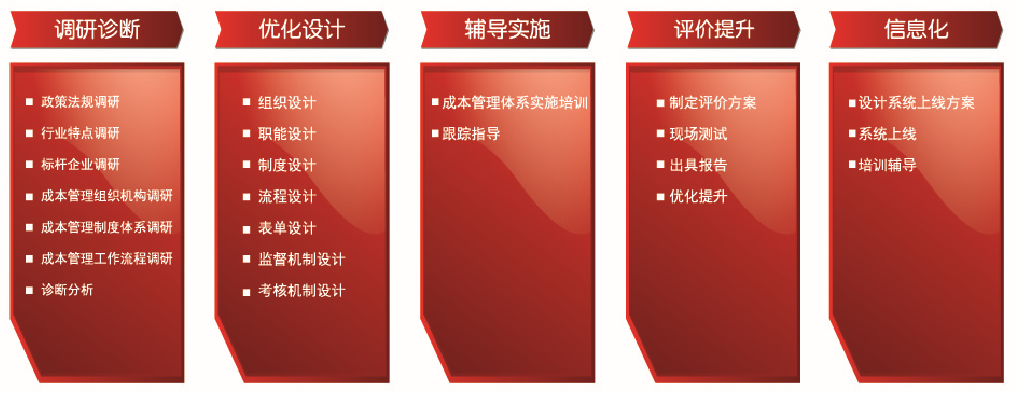 華夏經緯運用本公司前瞻性開展的相關研究成果及國際先進成本管理方法、工具,結合行業最佳成本管理實踐,按照“成本預測、成本決策、成本計劃、成本控制、成本核算、成本分析、成本考核”七個環節,對企業的成本管理現狀進行全面診斷,為企業建立健全全面成本管理體系,提高成本管理水平,增強企業競爭力。