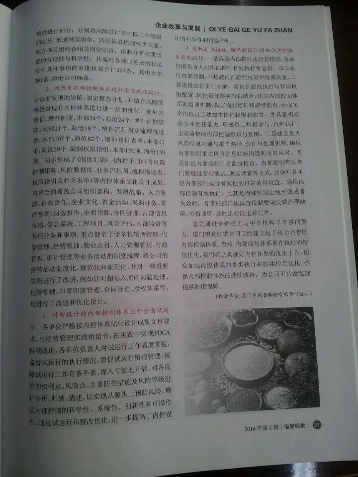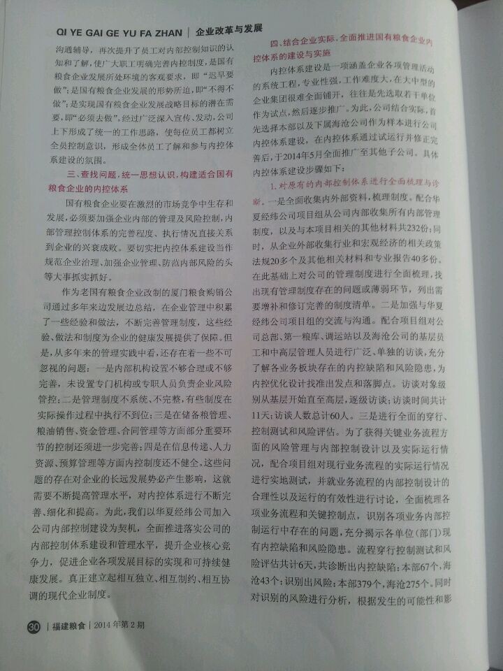 2014年6月份,廈門市糧食購銷有限責任公司財務部余孟詔經理在由福建省糧食局、福建省糧食行業協會聯合舉辦的刊物《福建糧食》2014年第二期上發表了《淺談國有糧食企業內控建設》的文章。文章中闡述了2013年華夏經緯財務咨詢(廈門)有限公司協助廈門糧食購銷公司建立起了較為完善的內部控制體系,為廈門糧食購銷公司的穩健持續發展提供了優良的內控環境。